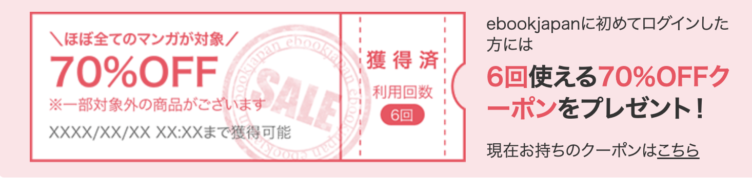 ebookjapanは、初回ログインで「70%OFFクーポン(上限700円)」が6回分もらえるのが大きな魅力。