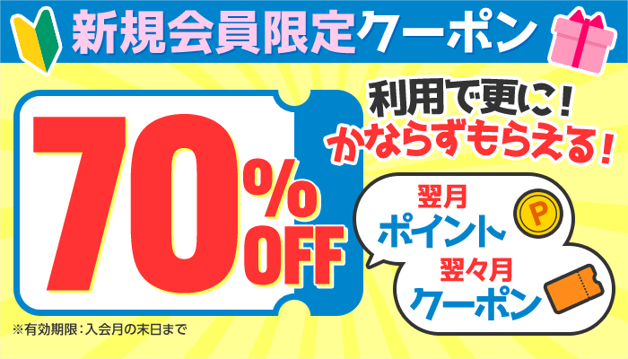 - 新規会員限定 70%OFFクーポン + 翌月ポイント + 翌々月クーポン
